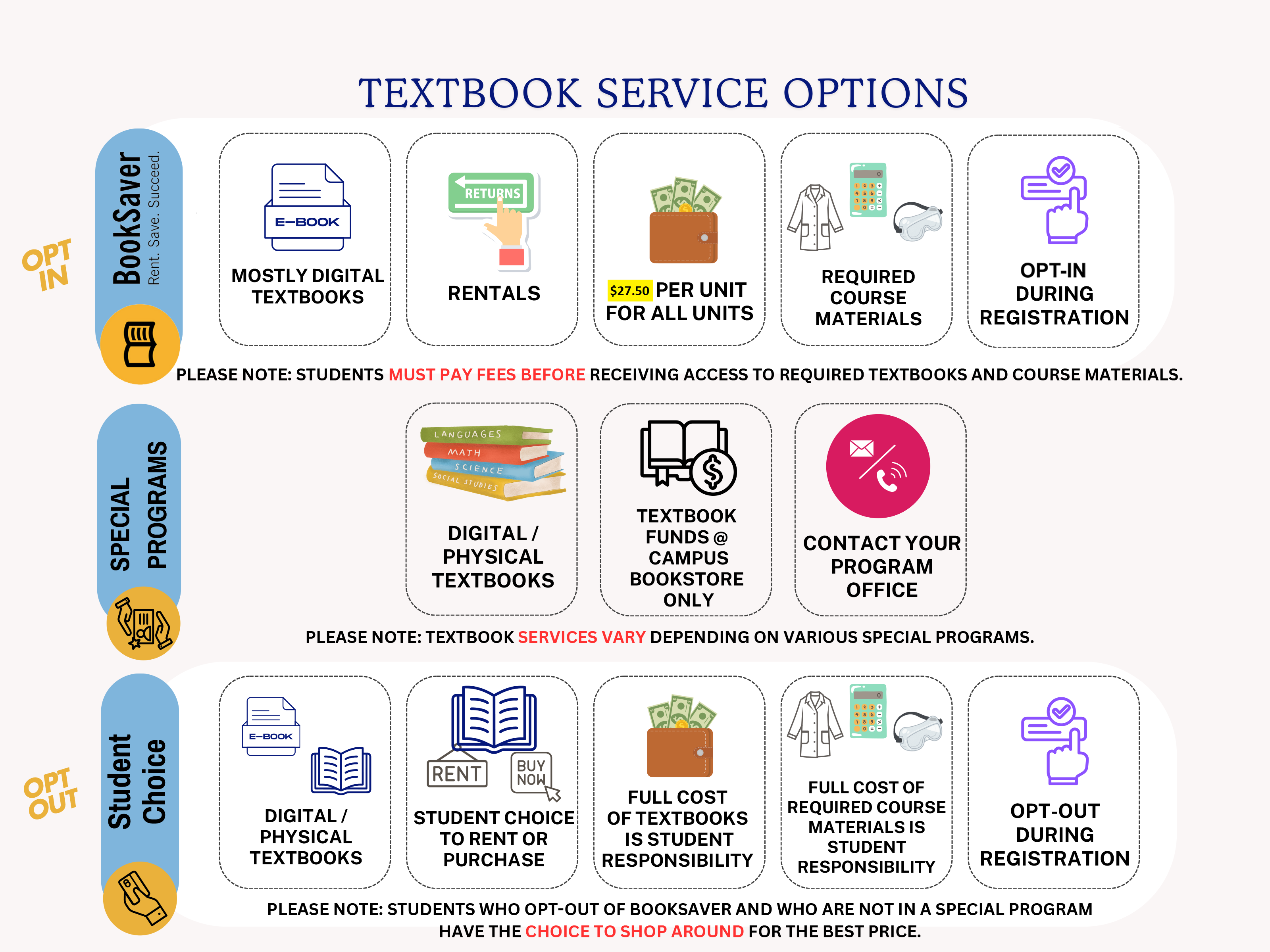 Opting Out: If you decide not to use BookSaver, you'll get your textbook support directly at the Campus Bookstore. EOPS, CARE, CalWORKs, or other special programs will inform the Campus Bookstore, and they'll add the amount you get to your bookstore account. This applies to required textbooks only.